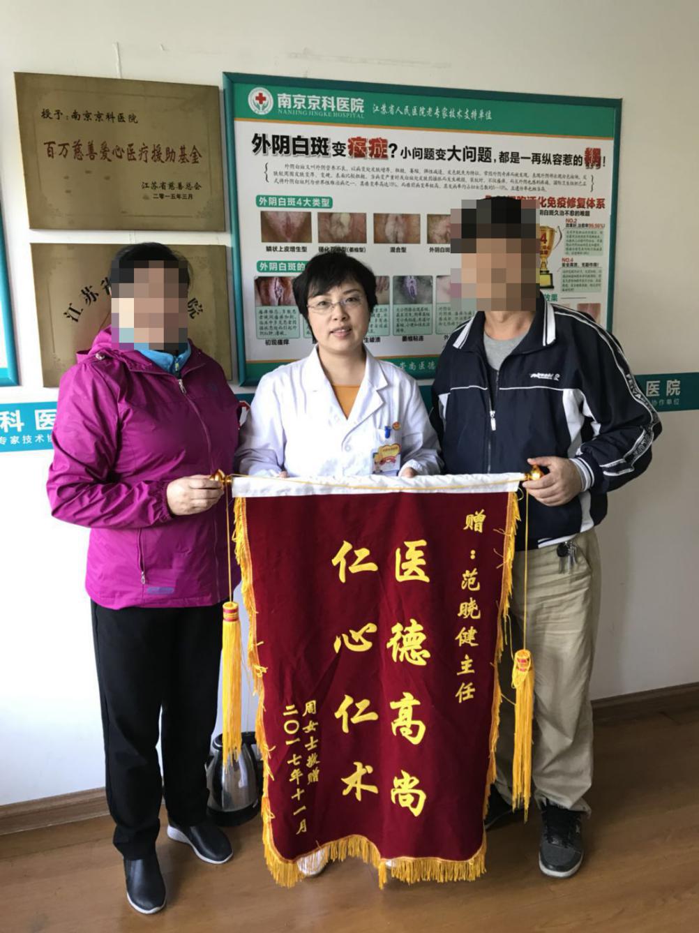 在妇儿堂治疗了两个多月,每半个月周阿姨都会在老公的陪伴下过来复查,治疗。慢慢的周阿姨也不痒了,外阴皮肤也慢慢的恢复了,心情也变得更好。于是和老公一起前来送锦旗,感谢范晓健主任,以后会多联系,继续观察,配合治疗。